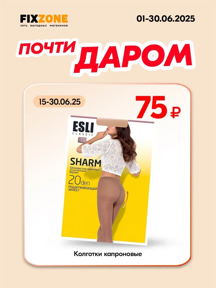 Лёгкость и комфорт по отличной цене! С 15 по 30 июня в FixZone - акция на капроновые колготки: всего 75₽ за пару. Идеальный вариант на лето - тонкие, удобные, по-настоящему выгодные. Запаситесь по хорошей цене - пригодится в любой момент. Ищите в FixZone с 15 июня - количество ограничено.