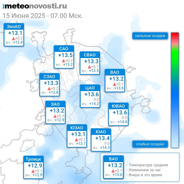 В 7:00 в Москве было от +12.7°C до +13.8°C, средняя температура +13.3°C #погода #Москва #лето #температура #15июня #воскресенье