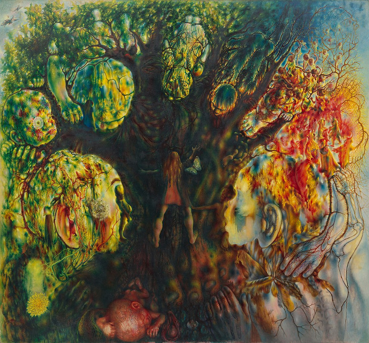 Эта картина чем-то похожа на иллюстрацию к медицинскому учебнику, а такие иллюстрации часто бывают жутковатыми. Множество младенцев – целиком и отдельные части тела – и справа все связаны кровеносной сетью с тем, что снаружи, а слева – с лесом и природой. Женщина ищет дитя, которое должно стать ее ребенком. Через эту женщину должен осуществиться его переход из внутреннего мира во внешний – собственно рождение.