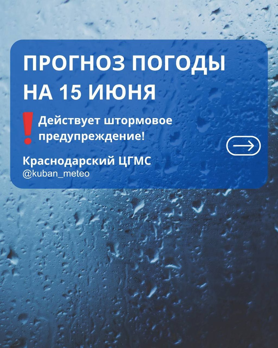 ☁️⛅⛈️ В связи с прохождением фронтальных разделов через территорию Краснодарского края специалистами @kuban_meteo объявлено ⚠️ штормовое предупреждение. 🌀 В течение суток 15 июня в крае ожидается комплекс метеорологических явлений: • сильный дождь, ливень в сочетании с грозой, • град, • порывы ветра до 20–25 м/с (КМЯ), • в отдельных районах — очень сильный дождь и ливень (ОЯ). 👇🏼 Подробный прогноз погоды на 15 июня: В Краснодарском крае — переменная облачность. ⛈ Местами кратковременный дождь. 🌧 В течение суток — местами сильный дождь, ливень в сочетании с грозой, градом и сильным ветром 20-25 м/с (КМЯ); в отдельных районах очень сильный дождь (ОЯ), сильный ливень (ОЯ). 💨 Ветер: юго-западный, западный 5–10 м/с, местами порывы 12–14 м/с. 🌡 Температура воздуха: • ночью +11…+16°, на Азовском побережье +13…+18° • днём +20…+25° • в горах ночью +3…+8°, днём +8…+13° • на Черноморском побережье ночью +13…+18°, днём +19…+24° 🏙 В Краснодаре — переменная облачность. 🌦 Ночью преимущест