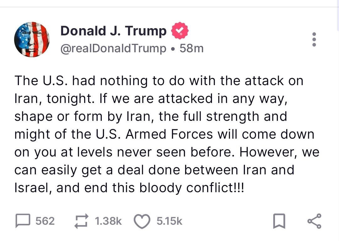 Президент Трамп некоторое время назад написал в Твиттере (очевидно, после запуска беспилотников по американской базе в Ираке в Айн аль-Асад): США не принимали участия в сегодняшнем нападении на Иран. Если Иран каким-либо образом нападет на нас, вся мощь вооруженных сил США нанесет удар по Ирану таким образом, какого еще не было. В то же время мы могли бы легко достичь соглашения между Израилем и Ираном и положить конец этому кровавому конфликту. Эти слова Трампа ретвитнули как министр обороны США, так и госсекретарь США.