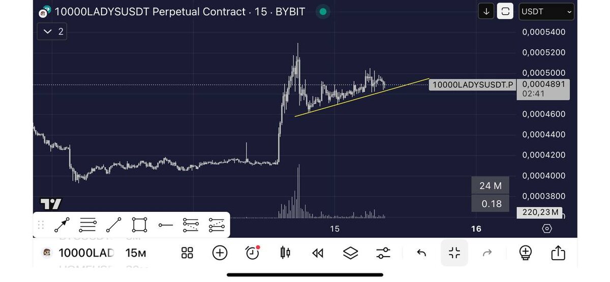 📉 #10000LADYSUSDT Объёмы за 24ч 24m Кареляция с btc 0.18 Изменение цены за 24ч +2.6 % В монету влили объемы за счет чего она вылетела. Сейчас наторговываем наклонный уровень, в пробой которого буду искать твх. В идеале нужно еще касание и проторговка перед пробоем.