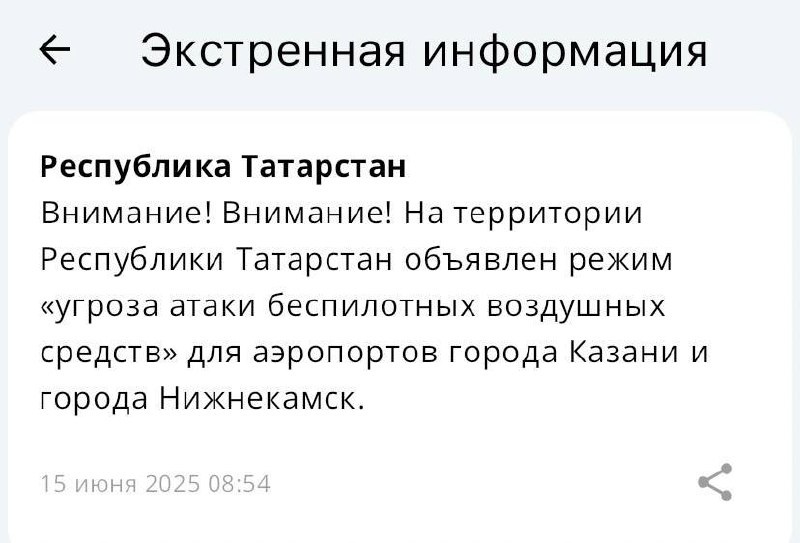 ❗️В Казани и Нижнекамске объявили об угрозе атаки БПЛА для аэропортов