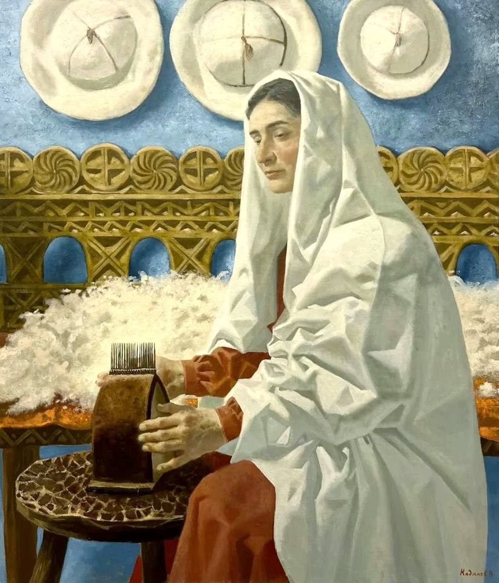 В. Каджаев, «За обработкой шерсти» (2023 г.) На переднем плане — пирæн («чесалка для шерсти»), металлический гребень на подставке. На заднем плане, на деревянном диване уже расчесанная шерсть. (@Obnovlenijemira)