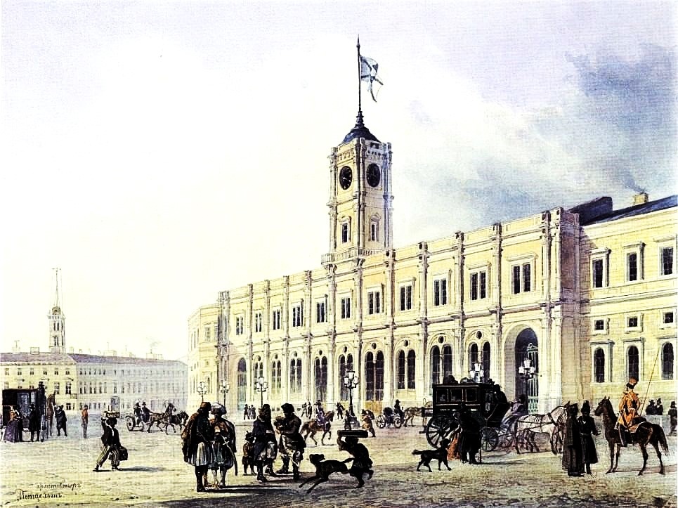 - "... Я поспешил в Большую Морскую в отделение почтовых карет, и, в ожидании отправления в дорогу, я любовался великолепным изящным зданием, недавно построенным для этого учреждения. Парадные, светлые, обширные сени, общий зал для пассажиров, украшенный роскошными диванами, коврами, зеркалами, роскошной мебелью, — все запечатлено вкусом и изяществом, все придумано для удобства и спокойствия путешественников. Заботливость об них до того простирается, что даже дворик, на котором они садятся в экипажи, покрыт стеклянным колпаком..."