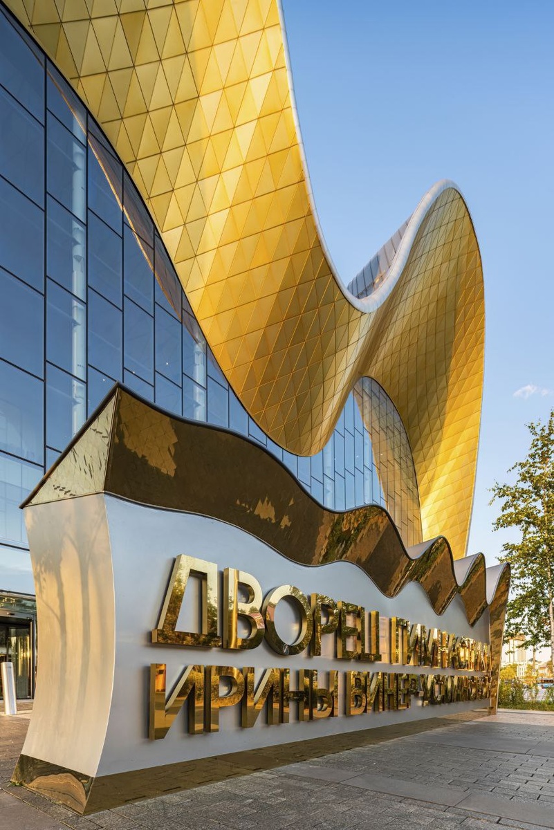Фрагменты фасада дворца гимнастики в Лужниках в лучах заката.