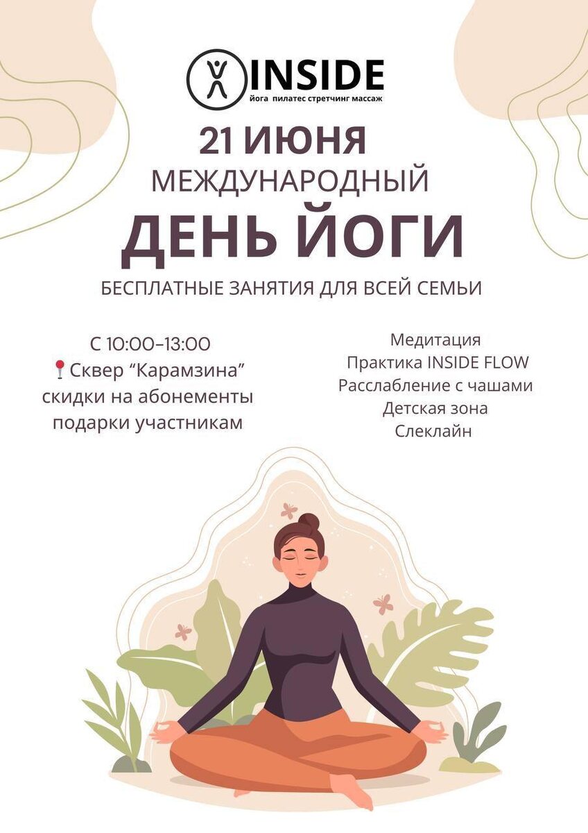 День Йоги от INSIDE YOGA STUDIO 🧘🏼♀️ 🗓️ 21 июня с 10:00 до 13:00 перенос 📍сквер Карамзина В программе бесплатные занятия - медитативные практики, виньяса-флоу, шавасана под звуки чаш и колокольчиков, детская йога и даже гвоздестояние. Регистрация по ссылке #21июня25