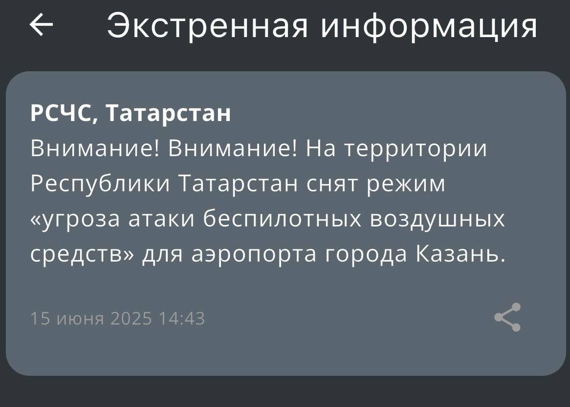 С 14.43 режим «Беспилотная опасность» на территории Татарстана снят. Об этом сообщило МЧС России в мобильном приложении. Напомним, что с 6.26 в республике объявлена опасность атаки БПЛА. Из-за этого могут возникнуть временные перебои с мобильным интернетом.