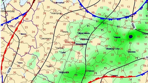 В понедельник циклон, который все выходные заливал дождями бОльшую часть Центральной России, постепенно уйдёт через районы Центрального Поволжья на северо-восток, заливая ливневыми дождями Республику Коми. Под влиянием области повышенного давления в Московской области облака начнут рассеиваться, проглянет солнце, и столбики термометров пересекут 20-градусную метку вверх, коснувшись днём значения в +25°. К сожалению, такие летние температуры и погодные условия продержатся только один день. Во вторник облаков уже будет больше, вечером возможен небольшой дождь, и температура воздуха уже не поднимется до таких значений, всего +21…+23°.В среду начнёт сказываться циклоническая циркуляция в атмосфере под влиянием приближения передней части ложбины с северо-запада и фронтальной зоны в ней. Такая ситуация благоприятно скажется на развитии конвективной облачности и дождях к вечеру дня. В четверг, по расчётам прогностических моделей, в этой ложбине образуется активный циклон, который пройдёт ливн