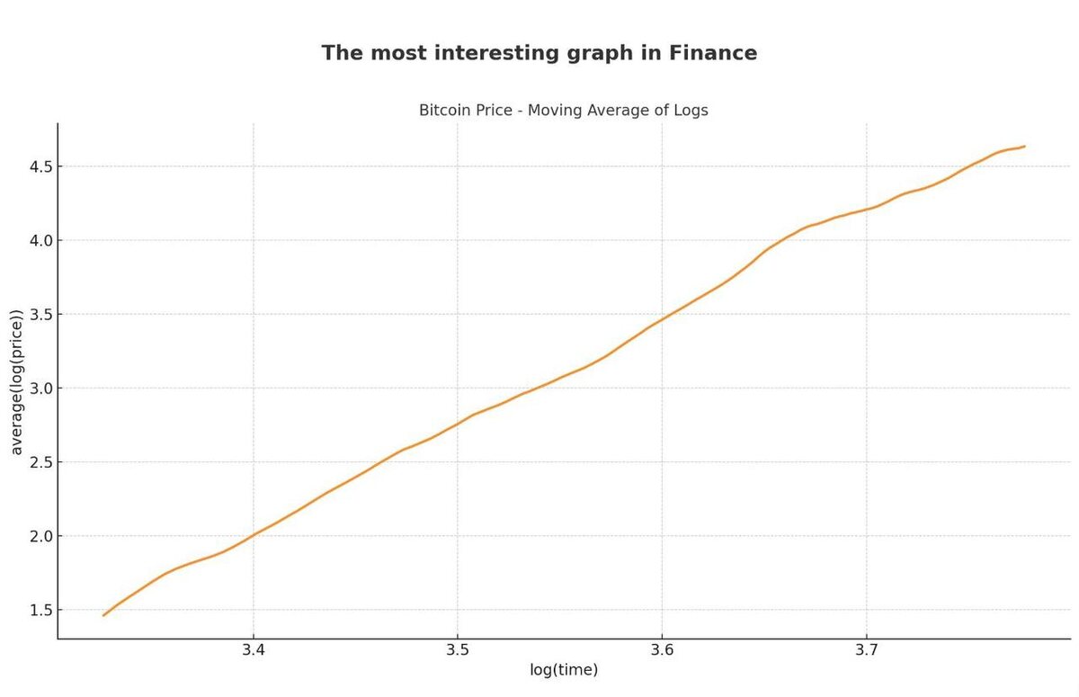 График, который меняет восприятие Биткойна навсегда Вот он — самый простой и мощный график во всём мире финансов: 4-летнее скользящее среднее от логарифма цены биткойна на фоне логарифма времени. И что мы получаем? Почти идеальную прямую. Коэффициент корреляции — 99.7%. Такого вы не увидите ни у одной акции, сырья или валюты. Что это значит? 1. Биткойн не хаос. Он растёт в очень чёткой, экспоненциальной модели. 2. 4-летний цикл — не просто красивая легенда. Это статистически подтверждённый паттерн. 3. Каждое отклонение от линии — не шум, а возможность. Те, кто покупал ниже этой линии, почти всегда выигрывали на горизонте 1–2 лет. Логарифм по логарифму — звучит как магия. Но это просто попытка заглянуть за фасад волатильности и увидеть фундаментальный тренд. Как это использовать: — Следить не за шумом, а за структурой — Понимать, где мы относительно «лог-лог линии» — Строить стратегию на годы, а не недели Биткойн — это не трейд. Это система координат. И этот график — её карта.