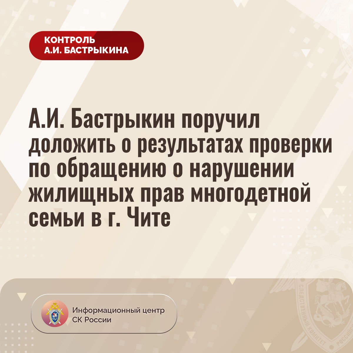 А.И. Бастрыкин поручил доложить о результатах проверки по обращению о нарушении жилищных прав многодетной семьи в г. Чите В приёмную Председателя СК России А.И. Бастрыкина «ВКонтакте» обратилась жительница города Читы, являющаяся многодетной матерью, по вопросу нарушения жилищных прав. В 2021 году жилое помещение женщины в многоквартирном доме, 1965 года постройки, признано непригодным для проживания. Однако до настоящего времени равнозначное благоустроенное жилье ей не предоставлено. Многочисленные обращения в профильные структуры результатов не принесли. В СУ СК России по Забайкальскому краю по поступившему обращению начата процессуальная проверка. Председатель Следственного комитета Российской Федерации Александр Иванович Бастрыкин поручил руководителю СУ СК России по Забайкальскому краю Алексею Юрьевичу Вольному доложить о предварительных и окончательных результатах процессуальной проверки. Исполнение поручения, а также ход процессуальной проверки поставлены на контроль в центральн