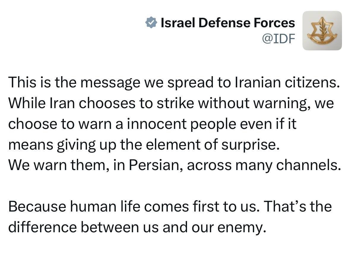 Армия обороны Израиля поясняет уведомления об эвакуации Ирану: «В то время как Иран выбирает атаку без предупреждения, мы решаем предупредить невинных людей, даже ценой отказа от элемента неожиданности. Мы предупреждаем их на персидском языке по многим каналам. Поскольку человеческая жизнь для нас на первом месте, в этом разница между нами и нашими врагами».