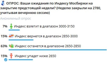 1️⃣ Опрос про ожидания по Индексу Мосбиржи! Неделю закрыли на уровне 2755, сделав за неделю -25 пункта! 63% - ВАНГИ! На втором месте был результат в 15%, ожидавших, что индекс укатают ниже 2650 на кошмаринге, и 15% - за ультрапозитивный рост выше 2850!
