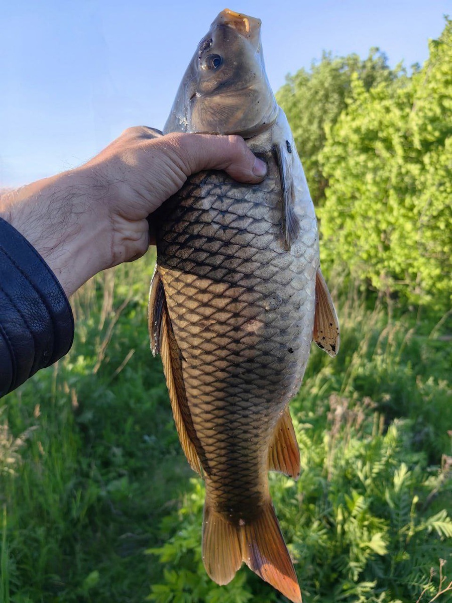 ‼️12.06.25‼️ 🚩 Река Красненькая Всего один, но зато какой пузатый. Стоило задремать, как удочка улетела застряв катушкой в рогатке, с горем пополам вытащил без подсака. Поклевок больше не было, но были явные покачивания кормушки мелочью. Карасик видно уже нерестится, слизь еще присутствует. Локация- ул. Доблести Пойман на бойл Wafters twincolor Клубника - Мед 12мм