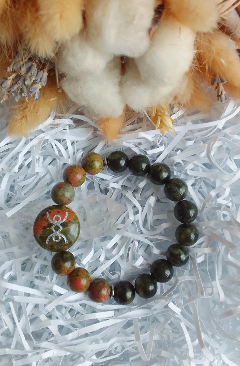 Браслет состоит из натуральных камней унакита, змеевика и руны «Равновесие». Русская руна «Равновесие» способствует гармонизации окружающего пространства, налаживания мира и лада. Руна помогает входить в контакт с окружающими и самим собой, избегать острых конфликтных ситуаций, крайностей, фанатической безудержности, помогает справиться с трудностями переломных моментов в жизни человека. Руна «Равновесие» помогает достигнуть баланса, успокоить страсти, привести эмоциональное состояние человека в норму, воспрепятствовав его повышенной возбудимости, улучшить настроение, приходить в состояние умиротворения, спокойствия, сдержанности, достигнув баланса материальной и духовной составляющей, между реальностью и вымыслом. Унакит считается символом гармонии, баланса и простой радости жизни. Камень, окрашенный в нежные зеленые и розовые тона, способен привнести весну в душу любого человека, наполняя её позитивом, душевным равновесием и покоем. Унакит помогает обрести внутреннюю гармонию, у