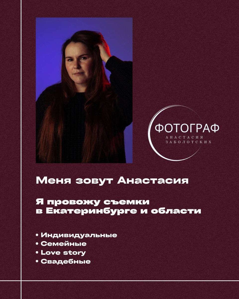 Анастасия Заболотских — фотограф из Екатеринбурга, работающая по всему городу и Свердловской области. Она проводит съёмки в разных форматах: — индивидуальные, — семейные, — love story, — а также творческие проекты по договорённости. К каждому герою съёмки Анастасия находит свой подход и всегда отдаёт много хороших, живых кадров. Не жди подходящего момента. Он уже есть. Ведь можно просто быть настоящей. Без поз, без фильтров, без “надо бы”. Показать, как ты чувствуешь себя. В лёгкости. В тишине. В силе. Ты красивая. Всегда. Пора быть в кадре. Давай снимем магию. P.S. Знакомство с фотографом скидка-10% Связаться с Анастасией можно по следующим каналам: - Телеграм: @AnastasiaZabolotskih - Инстаграм: a.zabolotskih - Вконтакте: https://vk.com/id710268316 - Ватсап: 89634407333