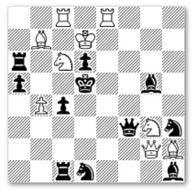 Автор задачи В. Копил, 2009 год. Много фигур на доске. Ход белых, белые начинают и ставят мат в 2 хода. Более мощная задача тут >>> Первый верный ход смотрите в галерее.