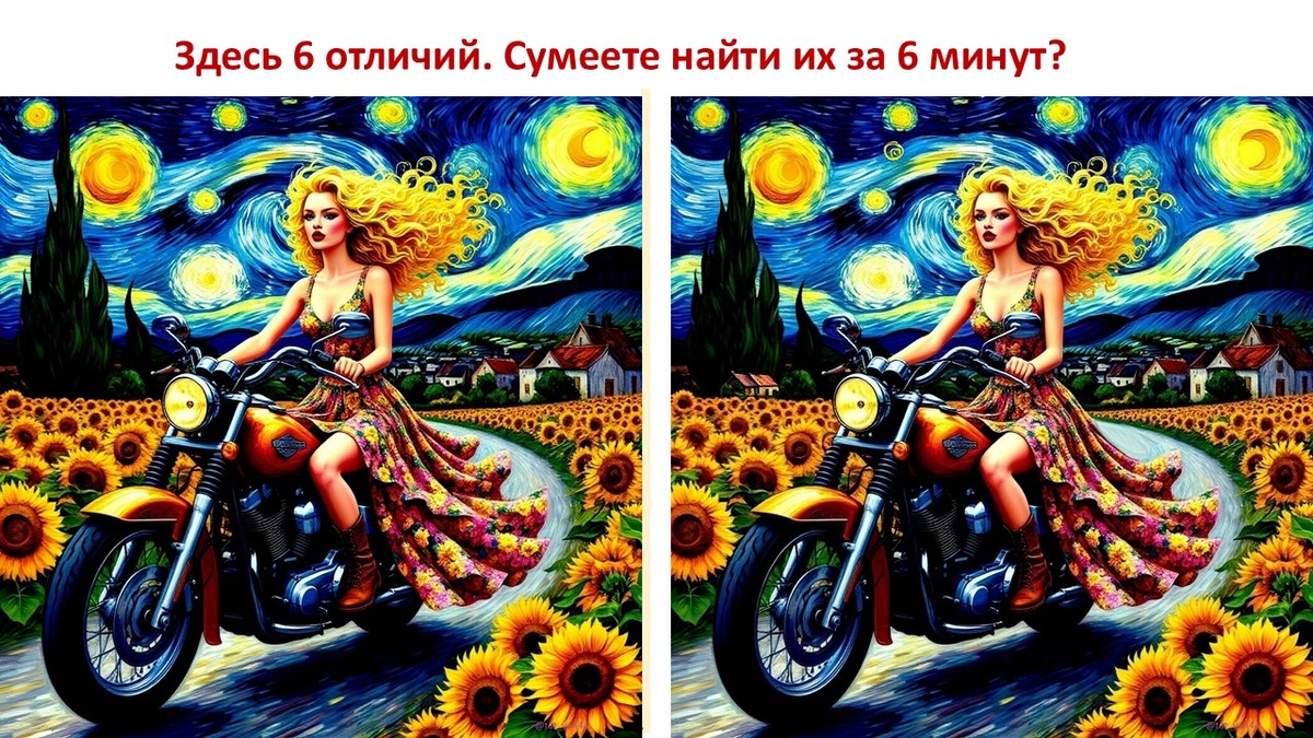 Представьте: Ван Гог пишет свою «Лунную ночь», вдохновлённый тишиной, звёздами и подсолнухами… но вдруг – рев мотора�💨. И перед художником возникает сие видение🤔. Как бы там ни было, но получилось две картины. Вроде, похожи. Но есть 6 отличий Сможете найти все несоответствия? Проверьте свою внимательность, пока девушка не укатила в закат! 🚀 (Ну что, поехали? Или вам нужно ещё больше безумия? 😆) Можно нажать на картинку, и тогда она увеличится (предупреждаю, одно отличие ОЧЕНЬ трудное, требует большой концентрации внимания) А теперь проверьте себя. 🔍 Нашёл все12 отличий за10 минут или быстрее: 🧠 "Гений внимательности"