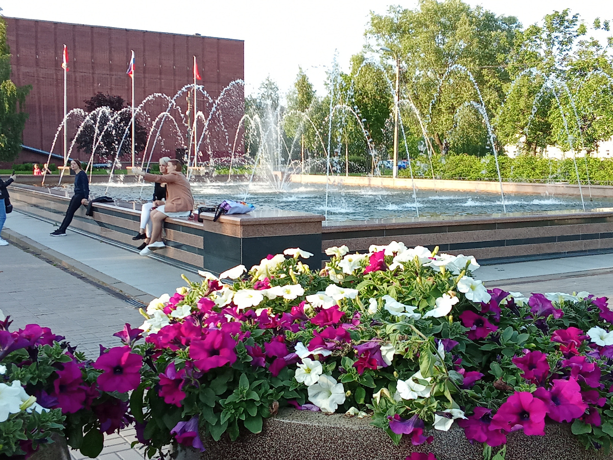 В сквере Героев все цветет. В огромных кашпо радует глаз петунья возле городского фонтана