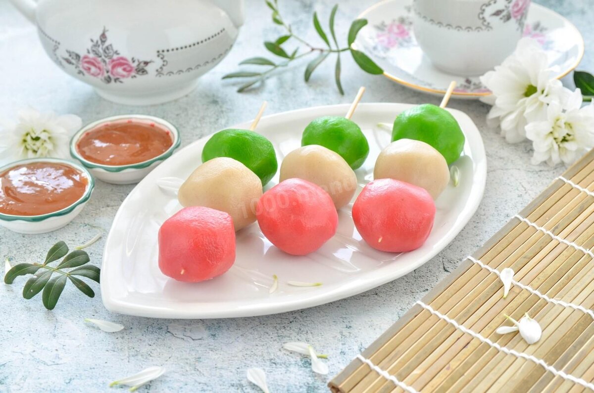 В самое сердце, родом из страны восходящего солнца! Японские данго — десерт из рисового теста, приготовленного на пару. Подаются данго со сладким соусом, а цвета символизируют процесс распускания цветков сакуры: розовый — это бутон, белый — цветок, а зеленый — листья