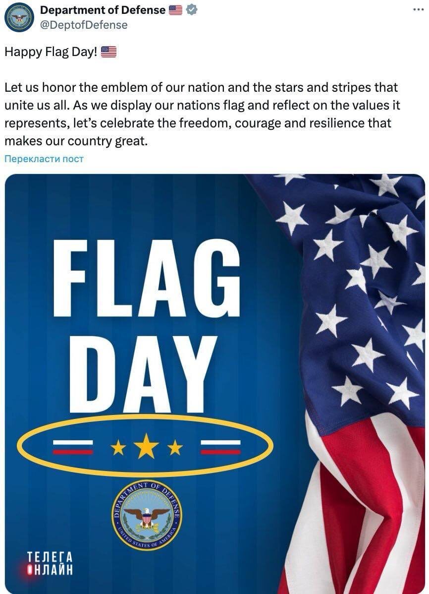 Пентагон выкатил праздничный пост ко Дню флага. Всё бы ничего — но на картинке вдруг... триколор РФ.