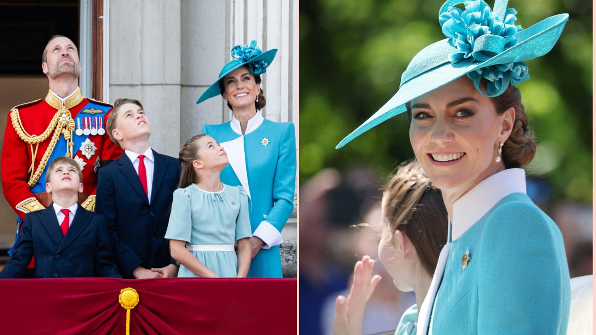 Во время военного парада Кейт, принцесса Уэльская, сидит рядом с королевской парой под павильоном с видом на парадную площадку.