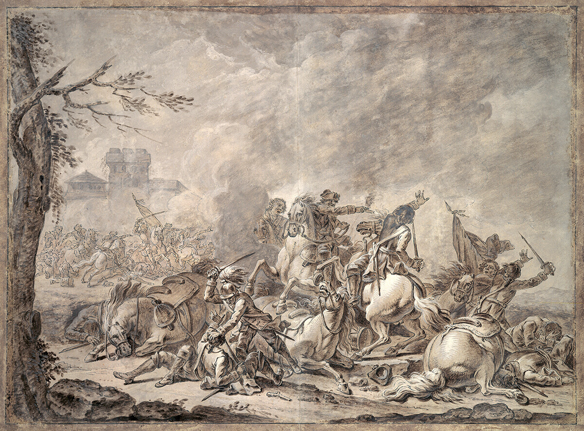 В Калужском музее изобразительных искусств хранится графическая работа, изображающая сцену кавалерийского боя и приписываемая французскому художнику Жаку Куртуа (1621 – 1676). Аннотирована она просто «Батальная сцена» и датирована серединой XVII в. На сайте музея произведение сопровождает краткая биографическая справка о художнике. Приведу ее начало: «Жак Куртуа – знаменитый французский живописец, рисовальщик и гравёр эпохи барокко. Художник писал преимущественно батальные сцены и приобрёл в этом жанре европейскую известность. Куртуа создал новую типологию батального жанра: вместо топографического вида с птичьего полета или фризовых композиций он изображает битвы кавалеристов, в которые вовлекается и зритель…» Заканчивается текст сведениями о провенансе произведения: «Рисунок поступил в музей в 1919 году из имения Барятино Тарусского уезда Калужской губернии в составе частного художественного собрания князей Горчаковых». Прежде, чем я выскажу свои суждения о рисунке из калужского музея