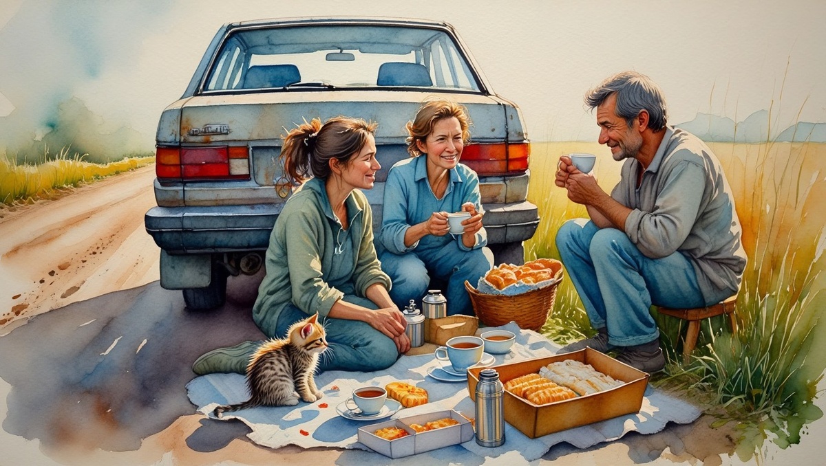 Дорога длинная, как чужая мысль. Машина барабанит по ямам — на заднем сиденье гремит старый термос, где-то за бортом разрастается июньский вечер. Я ехала без цели — просто убегала от всего, что оставила на кухне, где опять подвяли лук и паутина тянет к себе тени забот. На первом перекрёстке встречаю заторможенного котёнка — чужой, промокший, весь в грязи. У дороги — только волокна мятых пакетов и банальные поговорки “не лезь, оно не твоё”. На этот раз я торможу не думая. Достаю остатки бутерброда, смесь ужаса и бессмысленной нежности. Маленький зверёк забирается к ногам как к подножью алтаря — голова в крошках, глаза доверчивые, но испуганные сильнее моих тревог. [ начало здесь ] Я торопливо устраиваю “столовую” прямо на обочине. Стелюсь курткой, высыпаю найденный в бардачке корм — да, я не знаю, что делать дальше, но знаю: сейчас этот комочек жизни — мой главный собеседник. Спустя десять минут к нам медленно притормаживает микроавтобус с незнакомой парой. Рядом с женщиной — корзинка