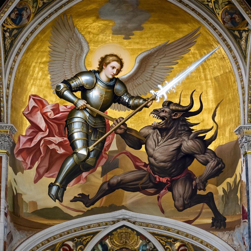 Загрохотали револьверы Илии, но они не могли нанести сильных травм. Демон схватил Илию и поднял его к куполу храма, где еще не высохла краска на лице архангела. Демон словно показывал старцу: «Вот смотри, где твой защитник. Никакой помощи от него не жди».