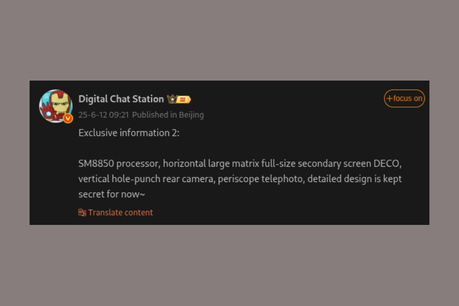 Как сообщает Gizmochina, устройство будет основано на чипсете Qualcomm SM8850 (Snapdragon 8 Elite 2), изготовленном по 3-нм техпроцессу TSMC. В тестах Geekbench 6 ожидается более 4000 баллов в однопоточном режиме и свыше 11 000 — в многопоточном. Графическая подсистема включает Adreno 840 GPU и 16 МБ GMEM. Основной набор памяти, вероятно, составят LPDDR5X и UFS 4.1, начиная с конфигурации 12 ГБ + 256 ГБ.