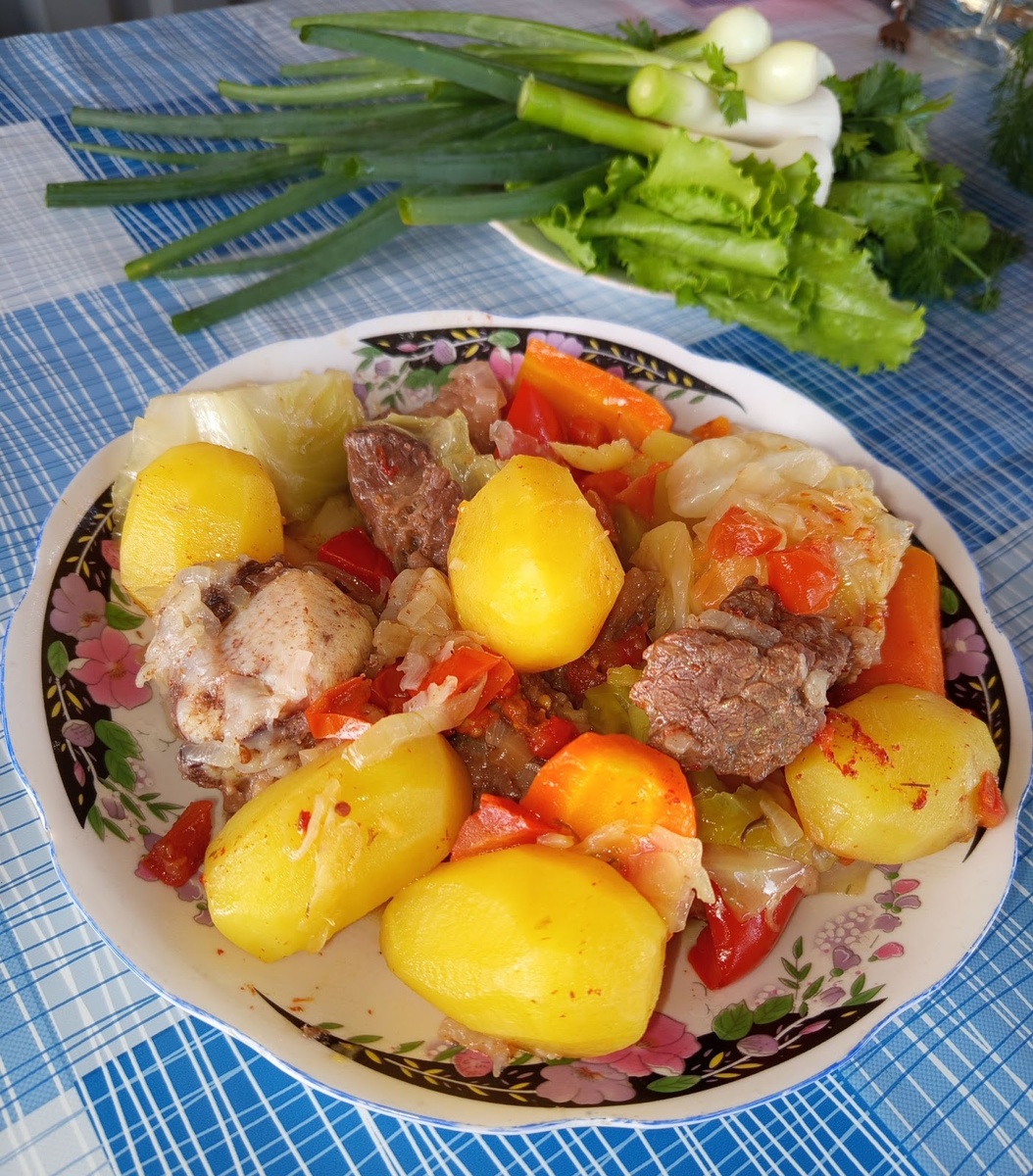 Привет, друзья! Потрясающе вкусный рецепт димламы, любимый нами за простоту в приготовлении и отличный вкус. Это блюдо полезно тем, что в нем много овощей и они не жарятся, а тушатся. Нижний слой мяса пропитывается соками свежих овощей и ароматами пряных трав. Лучше всего приготовить его на природе, в казане на костре. Мясо промыть, порезать на средние куски по 100-120 граммов. картофель,капусту, помидоры, острый перец, чеснок и зелень в пучках, которые легко удалить после приготовления. Каждый слой немного посолить. Добавить по краю казана воду, плотно накрыть крышкой и томить на медленном огне 1,5 часа. ❗Помешивать не надо! Это блюдо удобно тем, что пока оно готовится, можно накрыть на стол) Готовую димламу выложить на большое блюдо или ляган. Посыпать нарезанным зеленым луком или укропом. Приятного аппетита! Готовьте для себя и своих близких. Буду благодарна за лайки👍 и подписку :)