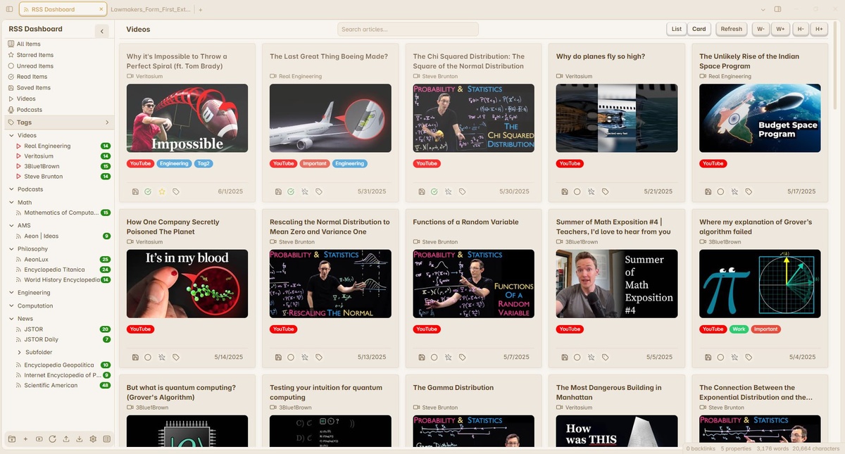 🗒 RSS Dashboard Помните я писал пост про классный концепт плагина, реализующего внутри Obsidian RSS-ридер? Автор не сидел сложа руки, и все-таки выкатил свое творение в свет. И я могу сказать, что это офигенно. Настанет день, когда я, с большой долей вероятности, откажусь еще от одной подписки, на этот раз на RSS от Reeder, и перевезу все в Obsidian. Уже сейчас плагин позволяет добавлять обычные RSS-фиды, YouTube-каналы, разделы Reddit. Есть вид списком и карточки, есть папки и подпапки, теги, возможность сохранять выбранный источник в свою картотеку в формте .md в один клик. На очереди у автора в Roadmap: - Мини-плеер для подкастов - Выделение и аннотирование источников (хм, таким образом и Zotero вытеснят, кто знает) - Расширенные фильтры и группировка - Больше видов (сейчас это список и карточки) - Какая-то аналитика - Горячие клавиши Но уже того, что есть, и что работает - вполне хватает чтобы создать себе этакую кастомную и персонализированную ленту новостей прямо внутри Obs