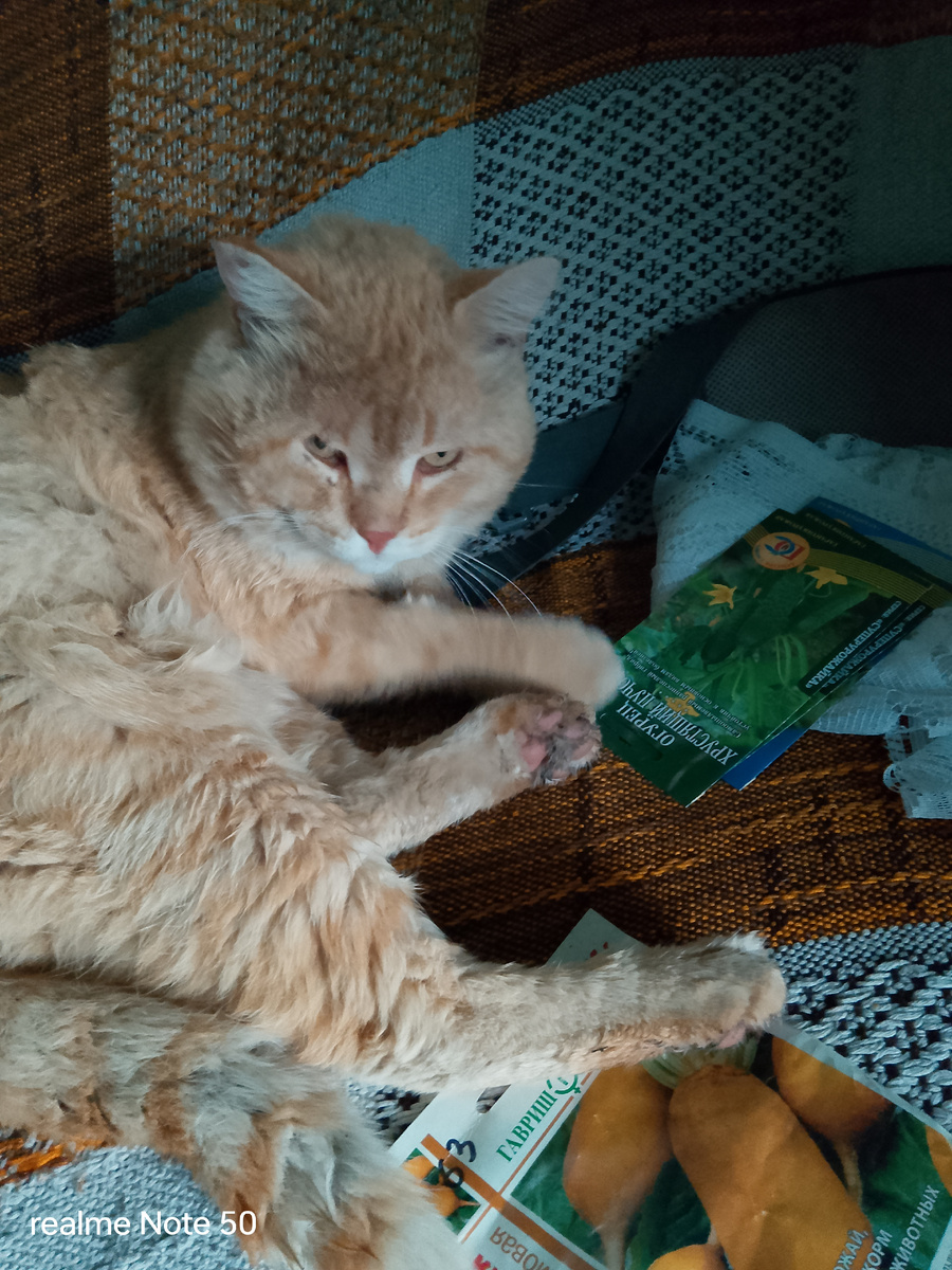 Дождь так и идёт. Соизволил прийти домой Рыжий, дней пять не было. Гуляет сам по себе, приходит только поесть. Рыжий это взрослый кот, ему уже лет семь, а может и больше. Я как то не помню в каком году он родился. У нас была кошка Муся и это её сын. Муся ушла и больше не вернулась. Очень была хорошая кошка, мышеловка. Так как она была мышеловка, то ходила она повсем сараям. Мышей ловила, птиц ловила, кроликов, цыплят, гусят. Всех ловила. А дедушка наш из вредности поставил капкан и попалась в него Муся мордой. Да так сильно, что всё морда была изорвана и походу нерв защемило. Мы её вылечили. Раны зажили, а голова нет. С ума она сошла вообщем. Рыжий был её последним котёнком. Какое-то время она его покормила, он открыл глаза и она его принесла мне, положила рядом со мной и ушла охотится, кормить почему-то бросила. Хорошо мы уже держали коз, я его выкормила. Так он сейчас мой маленький сынок. Ему мне кажется позволено больше чем моим детям 🤣, ну они так мне иногда говорят. Сейчас в