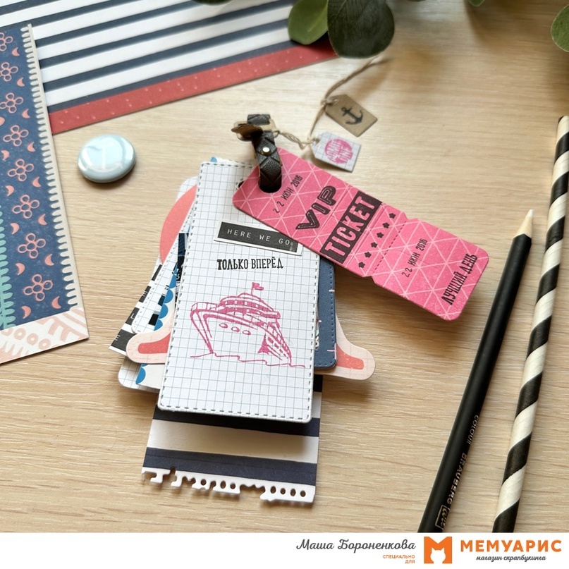 Разбавим летний зной прохладным речным ветерком. А лучше морским. Только волны, улыбки и вдохновение! Привет, друзья! В эфире Маша Бороненкова. Для нашего творческого «путешественного» задания я сделала крошечный миник. Давайте же скорее его рассмотрим! Основу мини-альбомчика составили разнообразные билетики и багажные бирки, которые я вырубила из обрезков скрап-бумаги и разных упаковок. Крепятся все они на ремешок из кожзама. По размеру он получился совсем малыш, помещается на ладони. Обратите внимание на набор ножей «Счастливый билет». По-моему, это настоящий мастхэв, билетики из него пригодятся не только для этого задания. Для оформления страничек я активно использовала штампы. В частности меня выручил набор от Питерского скрап-клуба «Живи сегодня» и фразы Agiart «Мгновения радости». Для заголовка я взяла буквы из сета Mimicut «АБВГДейка». А из одной бирки получился маленький шейкер, наполненный пайетками. Морскую тему мне помогли поддержать ножи «На дне морском-2». Спасибо за внима