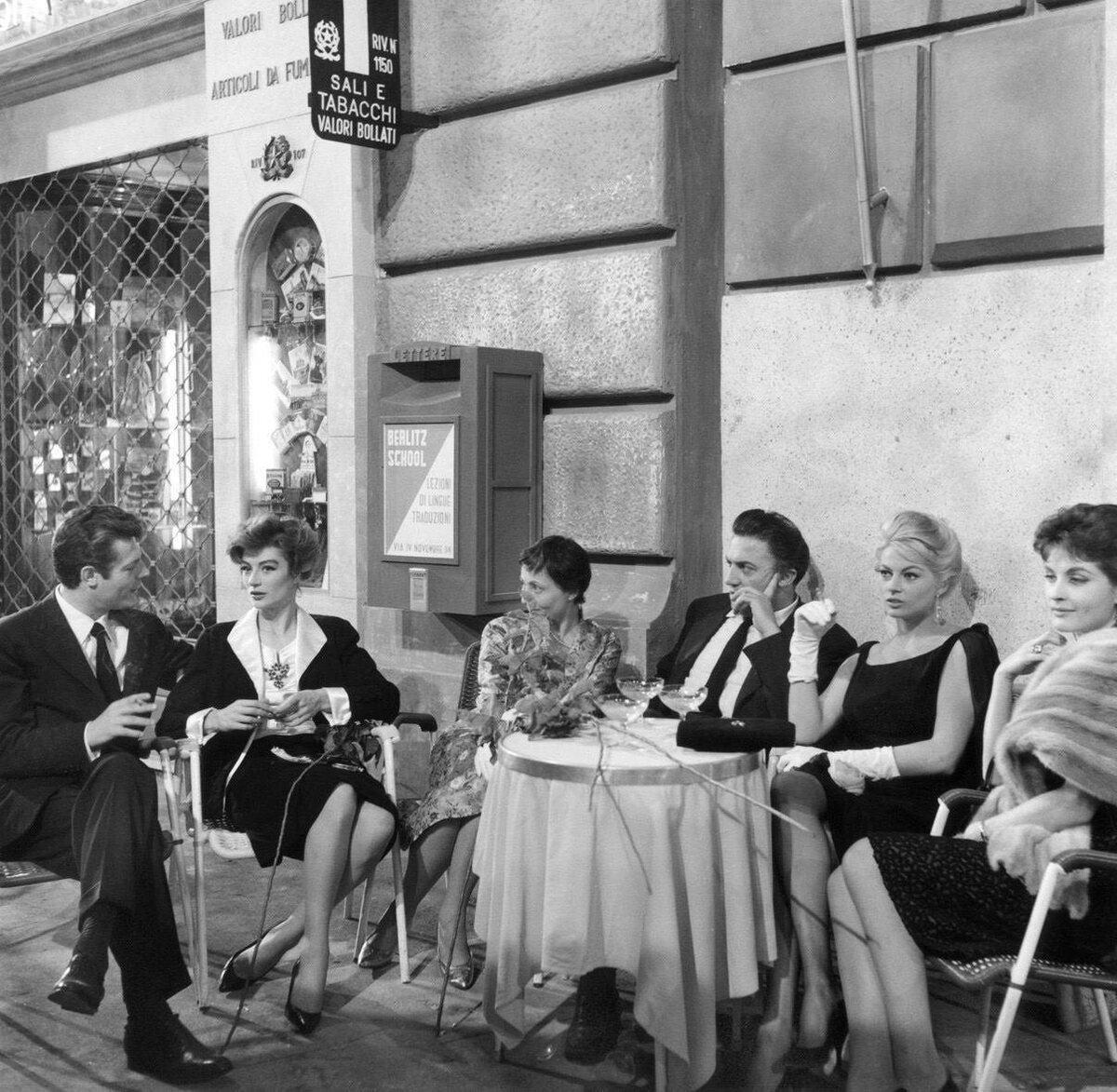 Уникальный кадр со съёмок «Сладкой жизни»: Марчелло Мастроянни, Анук Эме, Луиза Райнер, Федерико Феллини, Анита Экберг и Ивонн Фюрно вместе. Оглушительный успех фильмов Феллини всё-таки во многом оттого, что актерам ничего играть не приходилось. Как в случае с этой лентой — элита была элитой.