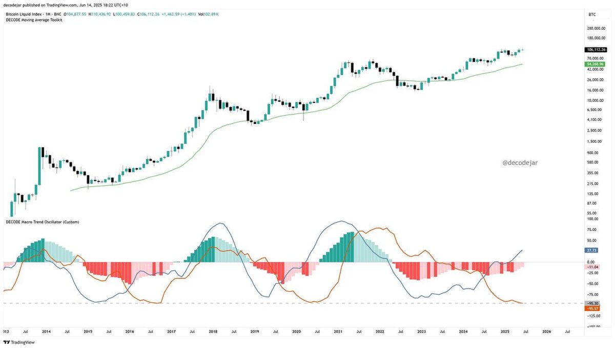 На графике — месячный индикатор Decode Macro Trend Oscillator, который прекрасно ловил макроциклы Биткойна: дно, разгон, пик и разворот.