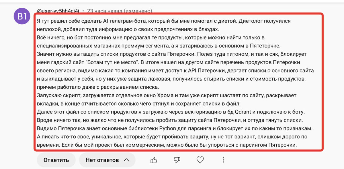 Мне пишут, удивительно- любопытный проект человек делает. Если вам лень читать на картинке, цитирую ниже: "Я тут решил себе сделать AI телеграм-бота, который бы мне помогал с диетой. Диетолог получился неплохой, добавил туда информацию о своих предпочтениях в блюдах. Всё ничего, но бот постоянно мне предлагал те продукты, которые можно найти только в специализированных магазинах премиум сегмента, а я затариваюсь в основном в Пятеторчке. Значит нужно вытащить списки продуктов с сайта Пятерочки. Полез туда питоном, и так и сяк, блокирует меня гадский сайт "Ботам тут не место". В итоге нашел на другом сайте перечень продуктов Пятерочки своего региона, видимо какая то компания имеет доступ к API Пятерочки, дергает списки с основного сайта и выкладывает у себя, но у них уже защита лажовая, получилось стырить списки и стоимость продуктов, причем работало даже с раскрыванием списка. Запускаю скрипт, загружается отдельное окно Хрома и там уже скрипт шастает по сайту, раскрывает вкладки, в