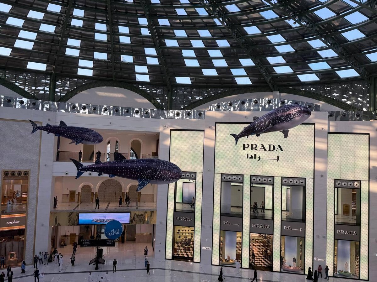 🐳 Китовые акулы заплыли в Place Vendôme Mall в Дохе Помните, как наши друзья из Dronico зажигали с дельфинами в Афимолле и в Саларисе? Теперь они покорили шикарный Place Vendôme Mall, жемчужину люксового ритейла – по воздуху плавают огромные китовые акулы! Почему именно китовые акулы? Всё дело в июне! Прямо сейчас у побережья Дохи, в районе Аль-Шахин, собираются сотни этих гигантов — крупнейших рыб на планете (до 18 м, между прочим!). Они приплывают сюда за вкусным планктоном и сардинами, которыми кишат воды Персидского залива из-за сезонного апвеллинга. Это самое масштабное скопление китовых акул в мире, и Катар активно продвигает экотуризм, зазывая дайверов и любителей природы. Кстати, китовые акулы — настоящая загадка! Они мирные фильтраторы, питаются планктоном, процеживая до 6000 литров воды в час, и ни разу не навредили человеку. А ещё никто не видел, как они рождаются или умирают — вот это тайна! Их пятнистая окраска уникальна, как отпечатки пальцев, а живут они до 130 лет.