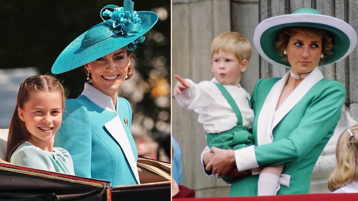 Принцесса Уэльская была одета в наряд, напоминающий тот, в котором принцесса Диана была на церемонии в 1988 году. Кейт Миддлтон была безупречно элегантна, когда 14 июня посетила церемонию Trooping the Colour в честь короля. Принцесса Уэльская была шикарна в бирюзовом платье-пальто от Catherine Walker, украшенном белыми деталями воротника, и соответствующем фасинаторе. Королевская особа уложила волосы в замысловатую прическу и сделала естественный макияж. Мать троих детей светилась от счастья, когда махала толпе, собравшейся у дворца в надежде увидеть принцессу. Образ особенно напоминал наряд покойной свекрови Кейт Миддлтон, принцессы Дианы, который она надела на это мероприятие в 1988 году. Тогда принцесса Уэльская была одета в яркое зеленое платье-пальто с белым воротником и шляпку в тон. Кейт Миддлтон и принцесса Диана сочетались со своими детьми: в 1988 году принц Гарри был одет с матерью в зеленые тона, а в 2025 году принцесса Шарлотта прекрасно сочеталась с Кейт в бирюзовом.