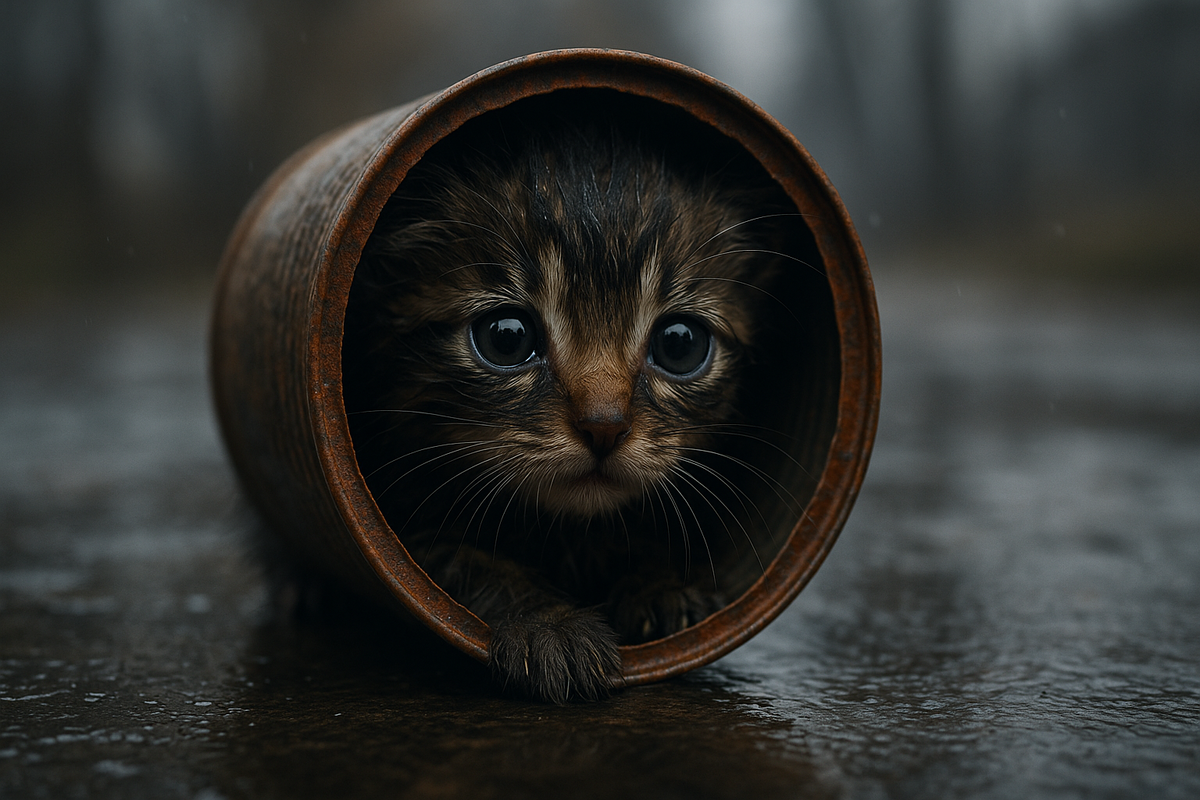 Он шёл мимо гаражей, когда услышал странный звук. Как будто кто-то плакал, но сквозь железо. Повернул голову. За мокрой, ржавой стеной шевелилось что-то серое, скомканное, дрожащее. Как старый платок, забытый под дождём. Он подошёл ближе. Там был котёнок. Его голова плотно застряла в ржавой консервной банке — та жадно обхватила его, как будто хотела сжать навсегда.
