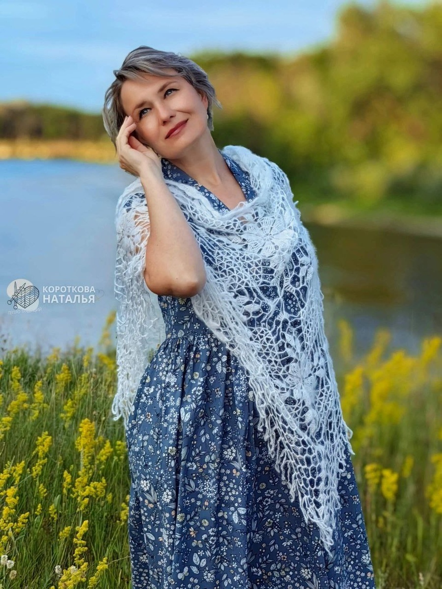 Пуховая шаль " Невесомость " - это женственность, уют и роскошь . Ажурная , пуховая , нарядная с красивым , воздушным , цветочным узором , достойного размера и удобной треугольной формы - это изделие будет отлично смотреться не только в качестве крестильной, венчальной , пасхальной и религиозной одежды, но и как повседневная нарядная накидка. Легкая , но теплая и приятная на ощупь ажурная шаль согреет холодными днями и украсит любой Ваш образ, окружая нежным облаком и прекрасно сочетаясь с любым стилем .."Невесомость" - это прекрасный выбор как для молодой девушки , так и для дамы постарше , своим нежным прикосновением эта кружевная накидка заставит в себя влюбиться и сама подарит любовь , а так же тепло , заботу и самые незабываемые , приятные ощущения . Главной особенностью представленного изделия является ее штучность и 100 % ручная работа ,созданная с соблюдением всех традиций пуховязания мастериц Прихоперья , начиная от сбора пуха и заканчивая обработкой готового изделия .