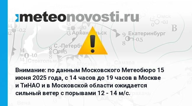 Внимание: по данным Московского Метеобюро 15 июня 2025 года, с 14 часов до 19 часов в Москве и ТиНАО и в Московской области ожидается сильный ветер с порывами 12 - 14 м/с. Перейти на сайт Прогноз погоды на 14 дней