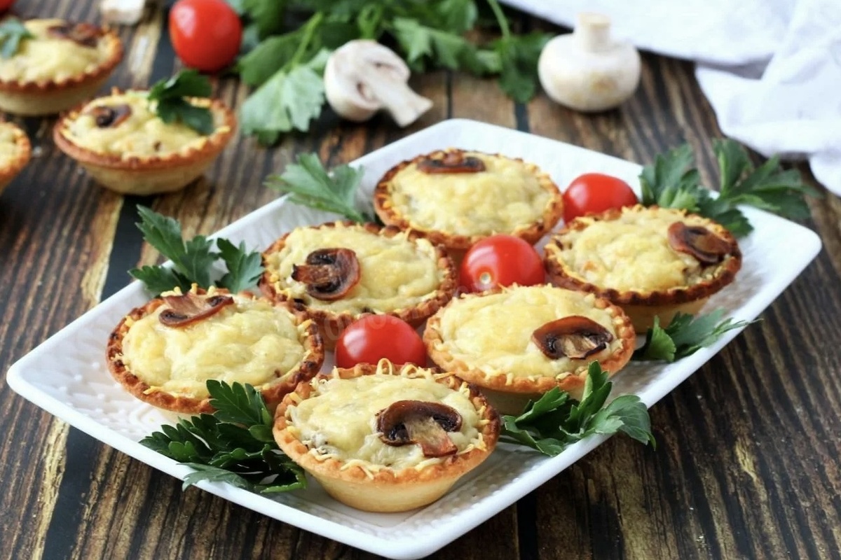 Ингредиенты: -шампиньоны или лесные грибы — 500 г; -лук репчатый — 1 шт.; -сливки 20% — 200 мл; -сметана — 100 г; -сыр твёрдый (Гауда, Чеддер или Эдам) — 150 г; -мука пшеничная — 1 ст. л.; -масло сливочное — 2 ст. л.; -соль — по вкусу; -перец чёрный молотый — по вкусу; -растительное масло — для жарки; -готовые тарталетки — 12–15 шт. Пошаговый рецепт: Грибы тщательно промыть и обсушить, нарезать тонкими ломтиками. Если используются лесные грибы, предварительно отварить их в подсоленной воде в течение 10 минут. Лук очистить и мелко нарезать. В сковороде разогреть растительное масло и обжарить лук до прозрачности на среднем огне. Добавить грибы и продолжать жарить, пока из них не испарится вся жидкость и они не приобретут золотистый цвет. В другой сковороде растопить сливочное масло, добавить муку и обжаривать, постоянно помешивая, в течение 1–2 минут. Постепенно влить сливки, продолжая помешивать, чтобы не было комочков. Варить на медленном огне до загустения. Затем добавить сметану,