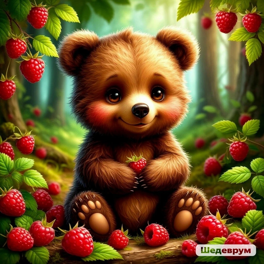 В чаще маленького леса жил Медвежонок. Он был пушистый и неуклюжий. Всё время Медвежонок проводил со своей Мамой-медведицей и не отходил от неё ни на шаг. Вместе они гуляли по лесу, ловили рыбу в ручье и лакомились вкусной малиной. Однажды, Медвежонку захотелось порадовать свою маму. Он проснулся с первыми лучами солнца и осторожно выглянул из берлоги, а затем медленно побрёл к малиновым кустам. - Смотри, Зайчик, я больше ягод смогу съесть! - А вот и нет! Зайцы больше ежей, поэтому больше съем я! С полянки, где обычно росла малина, доносились весёлые голоса. Раньше Медвежонок никогда их не слышал, поэтому притаился за стволом большого дерева и прислушался. - Ёжики хоть и маленькие, но у нас есть колючки, положу на каждую по малине и потом больше тебя съем. - А ты сейчас ешь, скоро придут сюда медведи и самого тебя съедят! - И то верно, каждый день они сюда приходят, огроменные следы лапами оставляют, так и видно на земле отпечатки больших когтей. Услышал слова зверят Медвежонок, задума