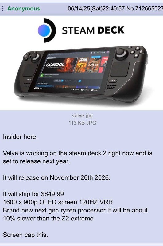 Инсайды про Steam Deck 2 — консоль обещает быть в два раза мощнее первой! • Под капотом свежий Ryzen (немного слабее Z2 Extreme). • OLED-дисплей 1600x900 с герцовкой 120 Гц. • Ценник — примерно 52к рублей. Ожидается релиз 26 ноября 2026. Ждём офф-объявления и готовим кошельки! Подробнее: https://hard-tm.su/threads/95773/ 🕹HARD-TM — Подписаться