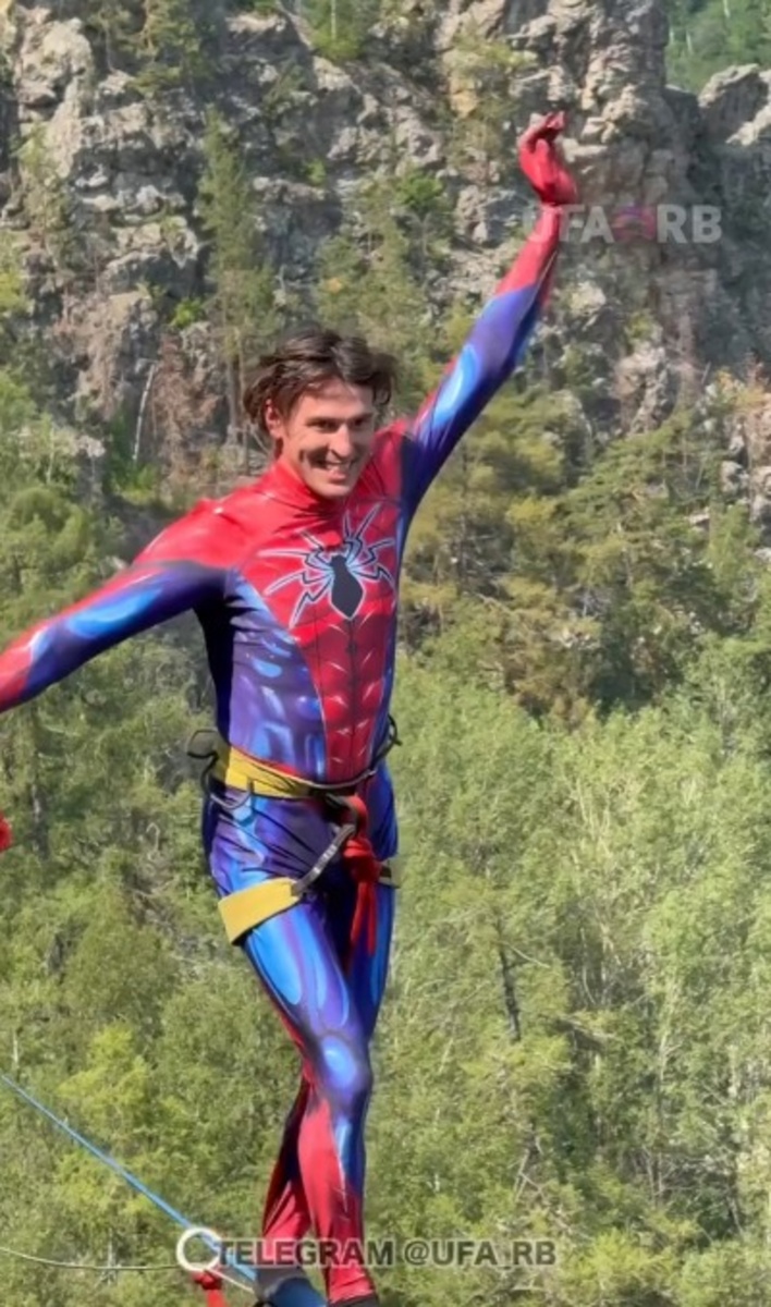 На Айгирских скалах в Башкирии очевидцы сняли на видео экстремала в костюме «человека-паука». Им оказался спортсмен Сергей Шилов. Он прошел по канату над пропастью на высоте 600 метров над уровнем моря.