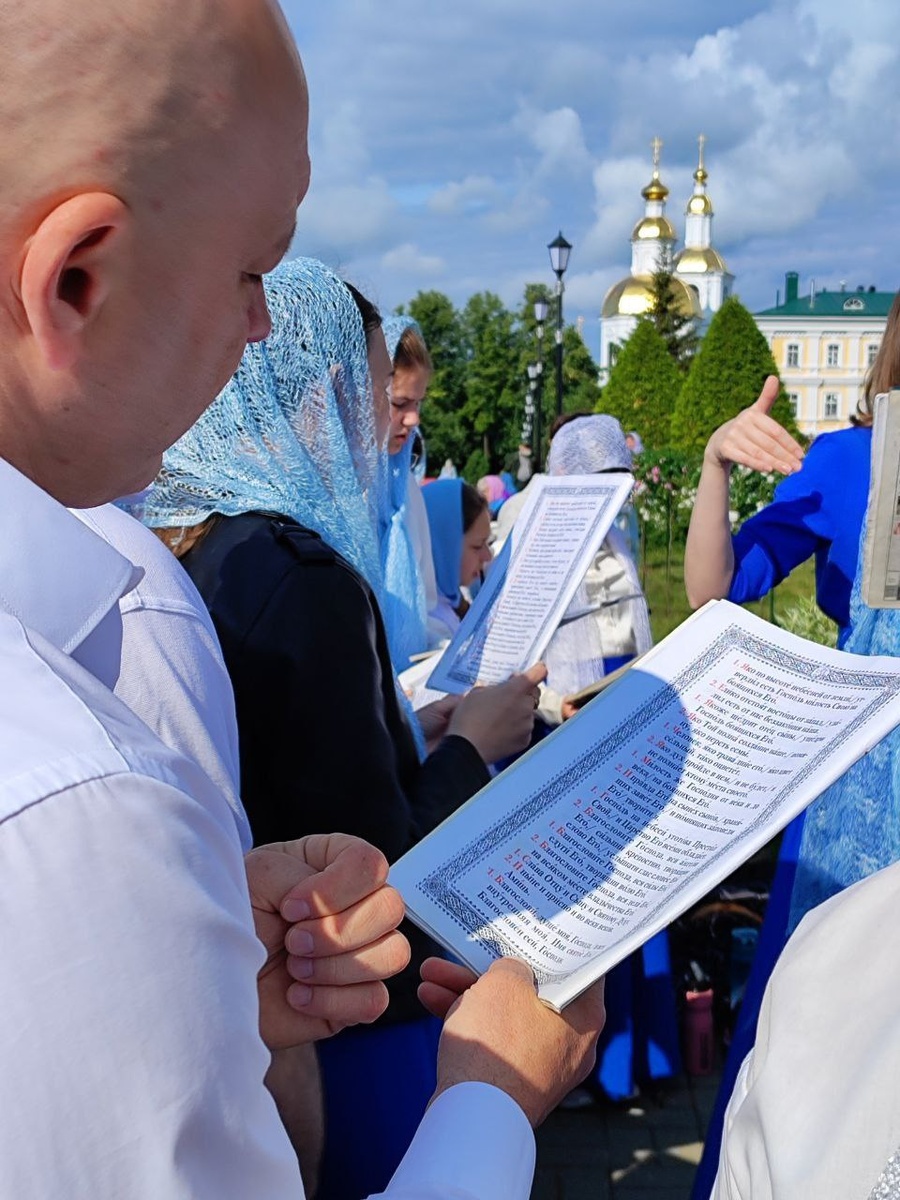 Спевка молодежного хора московского храма в честь Казанской Песчанской иконы Божией Матери (регент Екатерина Резникова) на соборной площади Серафимо-Дивеевского монастыря. Сегодня хор поет на поздней литургии в монастырском Преображенском соборе.