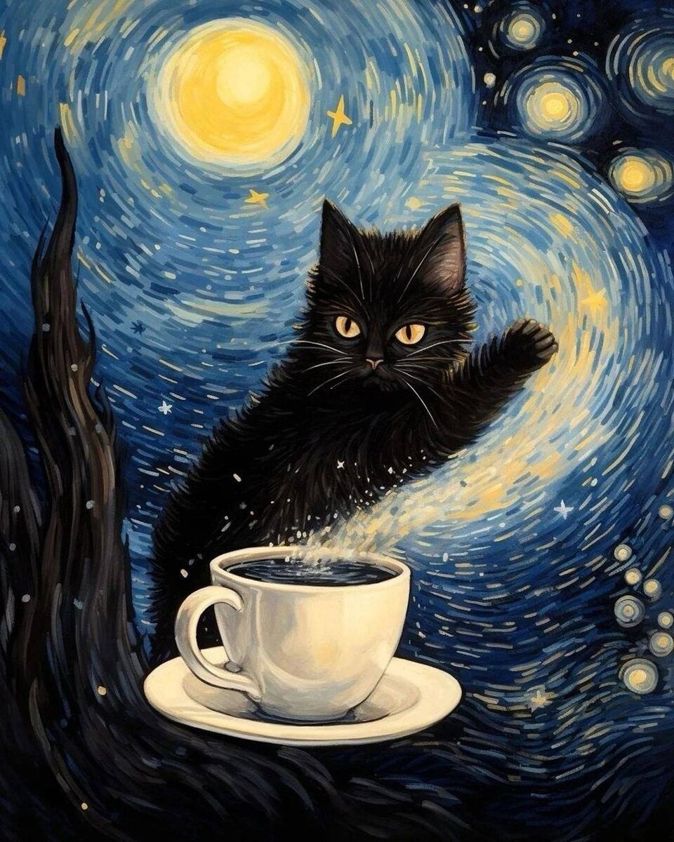 Коты под Ван Гога Кажется, Винсент Ван Гог был бы не против: в его культовой «Звёздной ночи» поселились коты. Они смотрят на звёздное небо, пьют чай и, конечно, философствуют. Всё — в характерной технике художника: вихревые мазки, ночное небо, мерцающие звёзды. Только теперь — с усами, хвостами и мягкой меланхолией. Это не просто мило. Это — культурный диалог: как и в оригинале, в этих картинах есть тишина, одиночество, немного сна и немного снабжённого юмора. Ван Гог бы, пожалуй, улыбнулся.