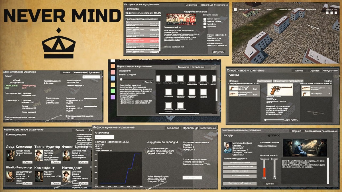 📸 ТЕКУЩЕЕ СОСТОЯНИЕ ПРОЕКТА Граждане! Пришло время подвести промежуточные итоги. Перед нами — сырая, но функциональная версия, требующая масштабной переработки: 🔴Ключевые проблемы: 🔸UI временный и технический (будет полностью переделан) 🔸Слишком сложные механики (упрощаем без потери глубины) 🔸Много неочевидных элементов (добавим обучение и подсказки) 🔧БЛИЖАЙШИЕ ИЗМЕНЕНИЯ ▫️Полный редизайн интерфейса (прощаемся с "техническим" видом) ▫️Оптимизация механик (сохраним глубину, но сделаем понятнее) В проекте много информационного шума и скрытых и сложных механик, это связано с тем, что автор преследует цель создания правдоподобного и проработанного симулятора в рамках вымышленного сеттинга. Спасибо, что остаётесь с нами! Ваша обратная связь бесценна. Да здравствует Её Величество! Следите за новостями в нашем телеграмме! #NeverMindDev #Отчёт_Разработки