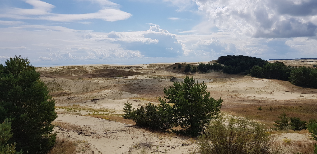 Отдыхать в Зеленоградске и не побывать на Куршской косе - это как не попасть в Москве на Красную площадь... Тем более, что она включена в список всемирного наследия ЮНЕСКО, вместе с Новодевичьем монастырём, Казанским Кремлём и вулканами Камчатки. Почти 100 км косы поровну поделены между Россией и Литвой. Въезд на косу через КПП, цена на 1 человека 400 рублей. Далее дорога проходит через лесной массив и, говорят, на дорогу часто выбегают дикие звери: зайцы, лисы, кабаны, олени. Причем водителям, нечаянно сбившим животное, полагается немалый штраф. Мы своими глазами видели лису, которая бегала рядом с сувенирными киосками - говорят, она периодически приходит поживиться провизией продавцов и нагло таскает из сумок бутерброды. Самое узкое место косы - в поселке Лесной, там всего 400 метров между ветренной Балтикой и сонным Куршским заливом. И при сильных штормах море захлестывает волнами до противоположного края. Танцующий лес - одно из очевидно туристических мест, но побывать там рекоме